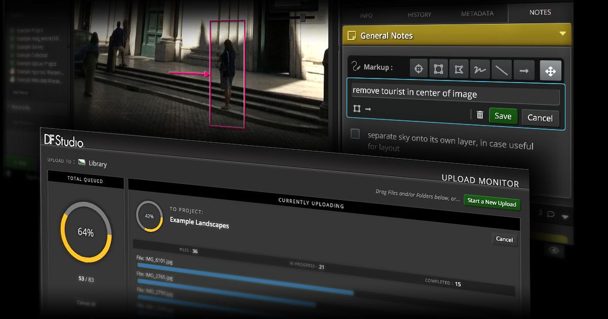 With a focus on collaboration and efficiency, DF Studio’s latest release incorporates a host of new and refined features built to streamline every workflow. New features under the Notes tab include visual annotations for an enhanced level of clarity when discussing DF Studio assets, as well as unprecedented collaboration functionality when sharing assets in a DF Studio Messenger. A completely re-engineered uploading experience makes it easier than ever to get files into DF Studio, with several enhancements to enable quick, intuitive customization of the storage options for imported assets. This allows a single upload operation to generate multiple new Projects or Library folders, and provides for fine-grained selection of Setup options.